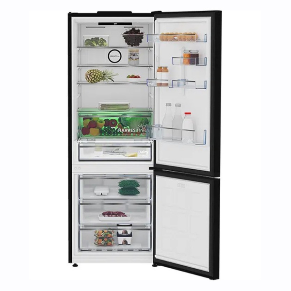 The Beko Fridge Freezer 490L, No Frost Black Glass, Bottom Freezer, 5-Year Warranty brings powerful, modern refrigeration to your kitchen with a sleek black glass facade and intuitive LED digital display. With a 490-liter total capacity (340L fridge and 150L freezer), it offers ample space for fresh and frozen foods, making it ideal for large households.
