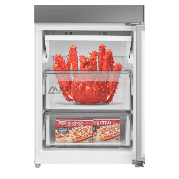 Inside the fridge, you’ll find 4 shelves, 2 vegetable crispers, and 4 door trays, all illuminated by LED lighting for clear visibility. The freezer section includes 2 drawers and a flip tray, offering flexible organization for frozen goods.